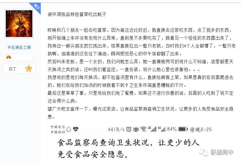 话说,小编这两天刚好在一论坛也看见了一篇吃饭吃出老鼠的帖子。