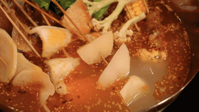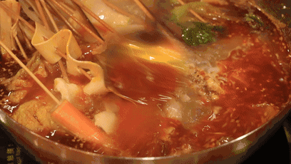 吃串串的时候,把食物都变得红通通好有食欲,巨蛋不怕死的要求了特辣,把所有的串串都染成了鲜红的颜色。