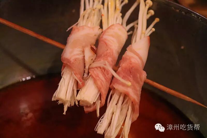 培根夹金针菇,这也是串串香里面必备的,特别是牛油过培根之后,会让原本烟熏过的培根变得柔嫩!肉类搭配蔬菜,轻松解腻。