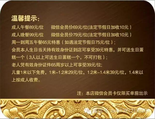 成为微信会员可享受周一到周五午餐【65】元/位,法定节假日除外。