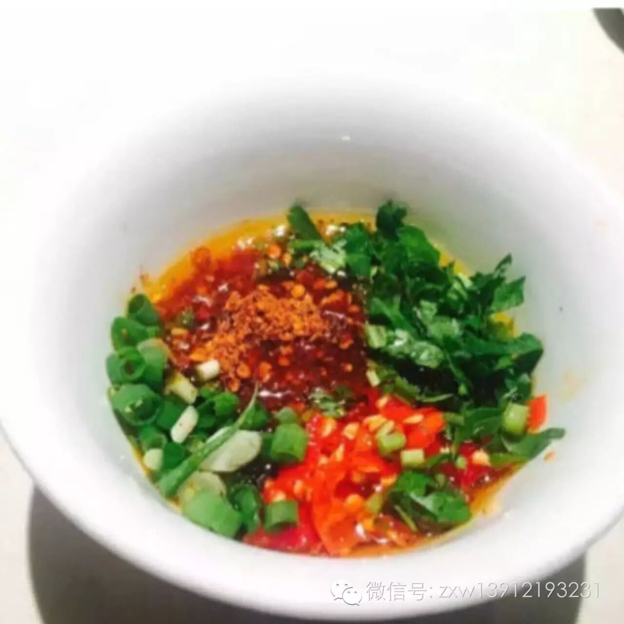 辣椒粉+辣椒油+小米辣+麻椒粉+葱+香菜