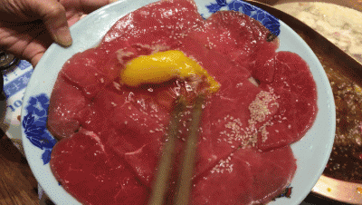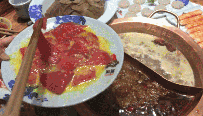 牛肉和鸡蛋创意结合。大片的牛肉,放下红油煮,肉汁和蛋液在口中迸发,感受牛肉上的“深水炸弹”被引爆后,舌尖慢慢变麻的刺激。