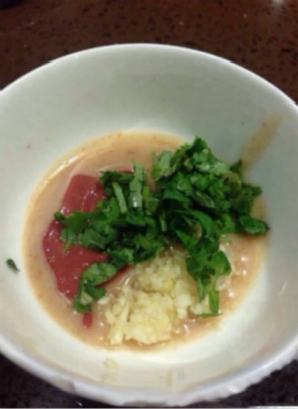制作方法:花生酱2茶匙(30g)海鲜酱油1茶匙(15g)蒜泥2茶匙(10g)海米、香菜、炸花生适量。