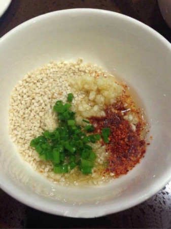 制作方法:香油2茶匙(30g)芝麻2茶匙(20g)花生碎2茶匙(20g)蒜泥1茶匙(15g)葱花适量,辣椒面适量。