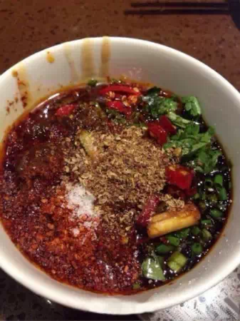 制作方法:辣椒油4茶匙(60g)辣椒粉1茶匙(10g)麻椒粉1茶匙(10g)小米椒适量,香菜葱花适量。
